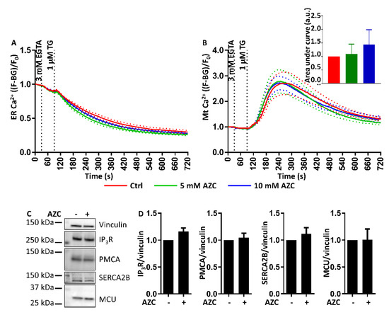 Because we observed a lower rise in cytosolic [Ca2+] upon application of TG after pretreatment with AZC, we hypothesized that AZC may lower the ER Ca2+ store content, or that Ca2+ transfer to the mitochondria may have been increased. In order to investigate this, we co-transfected cells with both G-CEPIA1er and R-GECO1mt to simultaneously detect ER Ca2+ and mitochondrial Ca2+, and treated the cells for 6 h with 5 mM or 10 mM AZC. EGTA was then applied and Ca2+ released from the ER with TG. Surprisingly, we did not detect differences in the ER Ca2+-leak rates between cells pretreated with either 5 mM or 10 mM AZC and untreated control cells (Figure 9A). Furthermore, the amount of Ca2+ transferred into the mitochondria after TG application was also very similar between AZC-treated cells and untreated cells (Figure 9B). Finally, the difference in the TG-triggered cytosolic [Ca2+] rise between AZC-treated and untreated cells could also not be linked to a change in expression levels of any of the major Ca2+-transport proteins, such as IP3Rs, PMCAs, SERCA2B, or the mitochondrial Ca2+ uniporter (MCU) (Figure 9C,D).