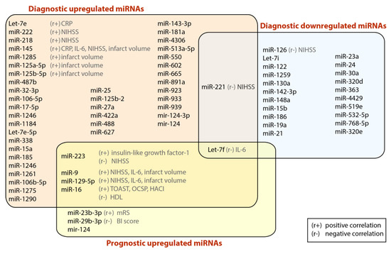 Regulation of diagnostic and prognostic miRNAs serving as biomarkers in ischemic stroke, based on human studies. Abbreviation: miRNA, microRNA; CRP, C-reactive protein; HDL, high density lipoprotein; NIHSS, National Institutes of Health Stroke Scale; IL-6, interleukin 6; TOAST, Trial of Org 10,172 in Acute Stroke Treatment; OCSP, Oxfordshire Community Stroke Project; HACI, hyperacute cerebral infarction; mRS, Modified Rankin Scale; BI, Barthel index. Refs: [41,43,44,45,47,48,53,55,57,58,61,62,67,68,72,73,74,75,76,78].