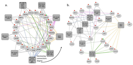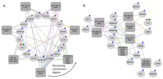 MiRNA-target interaction network was constructed using R programming and visualized using Cytoscape software v 3.6.1 [82]. miRNA-target interactions used for constructing the network were obtained from TargetScan and MirTarBase databases. In the next step we selected miRNAs targeting at least 5 genes associated with specific GO process (inflammation process; platelet activation; blood coagulation), and target genes regulated by at least 5 miRNAs (See Figure S1b). In the third step we subsetted miRNAs regulating at least 5 target genes from the network created in the first step. Final networks were created by using circular layout and direct force layout (See Figure S1c). Circular networks were sorted by the degree of connections between miRNAs and their targeted genes. It enabled to retrieve top miRNAs and top shared targets involved in analyzed GO process (See Figure 2a, Figure 3a, and Figure 4a). To retrieve gene–gene interactions between our top targets we used interactome datasets from String app v 1.2.2 for Cytoscape [83].