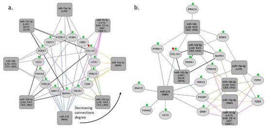 miRNA-target gene networks based on platelet activation. (a) Platelet activation-network sorted by the degree of connections, (b) Platelet activation-interaction network. The rectangles indicate the stroke type miRNAs, the ellipses indicate target genes. Red and green marks represent specific GO process-blood coagulation and platelet activation, respectively. LA, large artery stroke; SA, small artery stroke; UDN, stroke due to undetermined cause; CE, cardioembolic stroke; NaN, no data; ODE, other determined etiology; UN, determined cause.