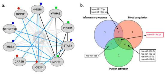 Most important genes targeted by miRNAs and overlapped miRNAs in GO process in IS. (a) Top ten genes targeted by miRNAs associated with IS. The circle in the middle indicates the stroke type miRNAs, the ellipses indicate target genes. Red, green and blue marks represent specific GO process-blood coagulation, platelet activation, and inflammation process, respectively. Black edges represent the high confidence connections between genes, blue edges represent low confidence connections. (b) Overlapped miRNAs in inflammatory response, blood coagulation, and platelet activation. 2 common miRNAs observed in inflammatory response and blood coagulation namely, miR-17-5p miR-106b-5p. 1 common miRNA observed in inflammatory response and platelet activation namely, miR-186. 4 common miRNAs observed in blood coagulation and platelet activation namely, miR-15b-5p, miR-15a-5p, miR-16-5p, miR-129-5p. 1 common miRNA observed in inflammatory response, blood coagulation and platelet activation namely, miR-19a-3p. miR, microRNA.