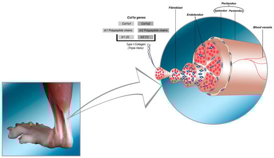 Tendons are soft tissues considered as inert and inextensible structures, even though they confer elastic properties that influence the muscle-tendon unit function [17,18]. Tendons constitute important structures of the musculoskeletal system that transmit muscle-generating tensile force to bones, resulting in movement [19,20,21,22]. While tendons are attached to muscles through the myotendinous junction, tendons are connected to bone through a fibrocartilaginous tissue called enthesis [23]. The force transmission from muscles to bones is possible because of the complex internal architecture of the tendon [24]. The structure of the tendon is arranged hierarchically by the tropocollagen, collagen fibrils, fibers, and fascicles [25] (Figure 1). A fascicle is a bundle of fibers [25]. Soluble tropocollagen molecules form cross-links to generate insoluble collagen, whose molecules are gradually assembled to arrange collagen fibrils [24]. A group of collagen fibrils, in turn, gives rise to collagen fiber, which corresponds to the basic unit of the tendon [21,24]. The fibrils are oriented within one collagen fiber in a three-dimensional arrangement (longitudinally, horizontally, and transversely), which forms spiral-type plait groups [24,26]. Sheaths of connective tissue surround the collagen fibers (endotendon) and the entire tendon (epitendon) [24]. While the endotendon is a thin reticular network of connective tissue inside the tendon, the epitendon constitutes a dense fibrillar network of collagen [26,27]. The endotendon arrangement enables the fiber groups to glide on each other and drives blood vessels and nerves to a deeper portion of the tendon [28].