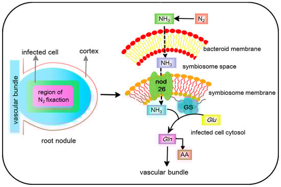 The assimilation of symbiotes fixes nitrogen to the plant cytosol, as the symbiosome membrane acts as a barrier. Nodulin 26 is an ammoniaporin [], and there is a high concentration of this on the symbiosome membrane, which facilitates NH3/NH4+ transport in a bidirectional manner []. Indeed, Nodulin-26 possesses a fivefold higher preference for ammonia compared to water []. The direction of transport would depend on the concentration gradient of NH3 across the symbiosome membrane. Upon transport to the infected cell cytosol, ATP-dependent glutamine synthetase (GS) can promote the ammonium ion to be assimilated into organic form []. This process could be accelerated by the combination of soybean nodule cytosolic GS with the nodulin 26 carboxyl terminal domain []. The association of GS with nodulin 26 can facilitate rapid nitrogen assimilation, preventing the accumulation of free ammonia in the cytosol nodulin 26, which has a potential interplay with GS to mediate ammonia efflux and assimilation (Figure 1).