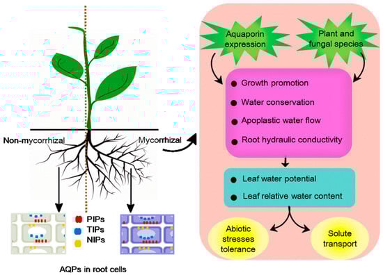 Mycorrhizae represent a very common symbiotic interaction between soil fungi and plant roots. The plant interface with mycorrhizal fungi may be intracellular (as with arbuscular mycorrhizae (AM)) or extracellular (as with ecto-mycorrhizae (EM)). In each case, mycorrhizal fungal mycelia improve nutrient status and water relations for their hosts, whereas the plant root provides carbon metabolites for nutrient assimilation. AQPs play an important role in both water and nutrient exchange in plant-mycorrhizal symbiosis []. Water conservation and absorption are two main mechanisms in plant-mycorrhizal symbiosis to cope better with stressful environmental conditions, such as drought, flooding, cold, or salinity [,,,,]. To improve water relations, mycorrhizal symbioses can actively modify the function and gene expression of plant aquaporins to influence conditions of relative apoplastic water flow [,,,,]. The regulation of plant AQPs seems to differ between the plant and fungal species that are involved in the symbiosis.