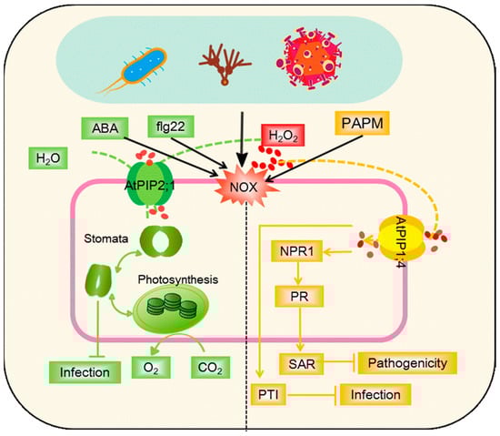 In considering the effects of AQP on physiological activity linked to disease, stomata are crucial to the control of plants’ water status in response to pathogens’ attack, and are potential entry points for foliar pathogens (Figure 3, green). Plants have the capacity to close their stomata after the perception of pathogen-associated molecular patterns (PAMP) to restrict bacterial invasion []. Rodrigues et al. [] proposed a model whereby flg22 (a 22-amino acid eubacterial flagellin-derived peptide, a PAMP) and abscisic acid (ABA) activated PIP2;1 through phosphorylation at a conserved site, to facilitate transport of both water and H2O2 to promote stomatal closure. H2O2 production in the stomatal guard cells appears to be elicited by both ABA and PAMP, which can be transported into the cytosol by AQPs to mediate stomatal movement, acting through PIP2;1 [,].