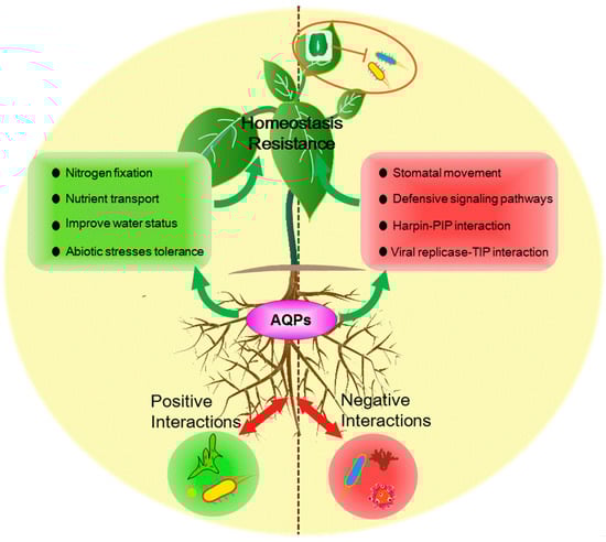 A well-characterized positive plant–microbe interaction is rhizobium-legume symbiosis. Legumes can establish symbioses with the nitrogen gas (N2)-fixing bacteria rhizobia, which leads to the formation of the root nodule []. N2 in the atmosphere is unavailable for direct use by most plants. Symbiosis can convert N2 to inorganic ammonium. N2-fixing symbiosis is significantly important for the nitrogen’s environmental-friendly input in both agricultural and natural ecosystems. In rhizobium-legume symbiosis, AQPs, especially nodulin 26-like intrinsic proteins, play an important regulatory role in nitrogen absorption and assimilation.