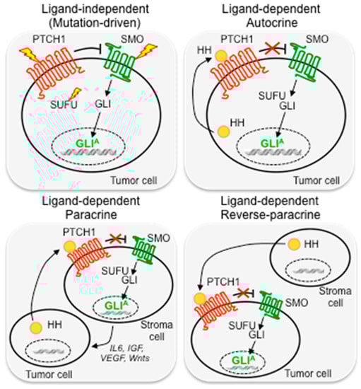 The ligand-dependent mechanism is another important mode of aberrant activation of HH signaling in cancer, characterized by the presence of HH ligands that activate the pathway. According to the secreted pattern of HH ligands, it can be autocrine, paracrine, and reverse paracrine. In the autocrine pattern, tumor cells secrete and respond to HH ligands. This type of activation has been described in several types of cancer, including lung, pancreas, gastrointestinal tract, prostate and colon cancer, glioma and melanoma, as well as in cancer stem cells [,,,,,,,,,]. In the paracrine pattern, a mode of action that resembles the physiological HH signaling during development, HH ligands secreted by cancer cells activate HH signaling in the surrounding stroma. Evidence supporting this mechanism has been revealed from studies in human tumor xenograft models of pancreatic and colorectal cancers []. Similarly, reverse paracrine HH pathway activation, in which HH ligands are secreted by the tumor microenvironment and activate the pathway in tumor cells, has been described in an experimental model of glioma [] and in hematological malignancies, such as B-cell lymphoma and mantle cell lymphoma [,] (Figure 2).