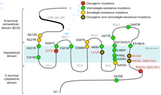 Schematic structure of the human SMO protein, showing the location of oncogenic mutations (red), vismodegib-resistance mutations (green), sonidegib-resistance mutations (orange) and oncogenic mutations associated with vismodegib resistance (red, green and black). Numbers represent amino acids. Human SMO contains 787 amino acids organized in three main domains: the N-terminal extracellular domain (ECD) (residues 1–220), containing a cysteine-rich domain (CRD); the heptahelical membrane spanning (7-TM) domain (TMD) (residues 221–558); the C-terminal cytoplasmic domain (residues 559–787). The TMD consists of seven transmembrane domains connected by three extracellular loops (ECL1–3) outside of the plasma membrane and three intracellular loops (ICL1–3). See Table 1 for details about mutations.