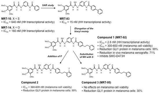 Recently, a novel class of SMO inhibitors based on acylthiourea, acylurea, and acylguanidine scaffolds have been developed (Figure 4). An initial virtual-screening-based discovery identified MRT-10, an SMO antagonist displaying a unique acylthiourea scaffold. MRT-10 was shown to bind to SMO at the level of the BODIPY-cyclopamine binding site. It displayed an IC50 value of 0.64 μM in a Shh-light 2 cell luciferase assay and the ability to inhibit SAG-induced differentiation of C3H10T1/2 cells []. Its acylurea analog (MRT-14) blocked BODIPY-cyclopamine binding to SMO in a dose-dependent manner and showed improved inhibitory activity against the HH pathway, with an IC50 value of 0.16 μM in a Shh-light 2 cell luciferase assay and increased inhibition of C3H10T1/2 cell differentiation [].