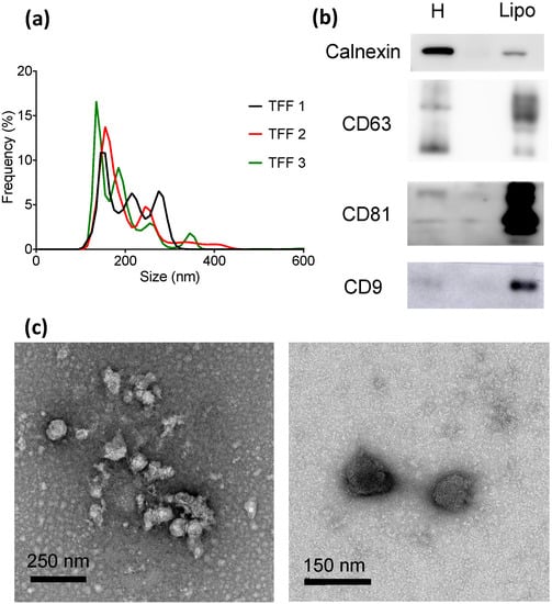 - Théry, C.; Witwer, K.W.; Aikawa, E.; Alcaraz, M.J.; Anderson, J.D.; Andriantsitohaina, R.; Antoniou, A.; Arab, T.; Archer, F.; Atkin-Smith, G.K.; et al. Minimal information for studies of extracellular vesicles 2018 (MISEV2018): A position statement of the International Society for Extracellular Vesicles and update of the MISEV2014 guidelines. J. Extracell. Vesicles 2018, 7, 1535750. [Google Scholar] [CrossRef]
