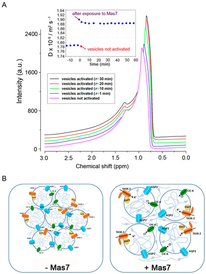 Structural changes of the vesicles secondary to exposure to Mas7 were also supported by the 1H spectra analysis, shown in Figure 4A, wherein the time evolution of the proton spectrum before and soon after the activation process of the vesicles is detected. With respect to pure water (set at 0 ppm), the chemical shift of the vesicles suspension signal is found at lower field, is quite broad (Full Width at Half Maximum, FWHM ~190 Hz) and very asymmetric, suggesting multiple water environments that are not in rapid (on the NMR time scale) equilibrium with each other. Confinements of water molecules are consistent with a complex vesicular system wherein water inside and between the vesicles is present. Under these conditions the greatest contribution to the signal derives from water between the vesicles, as it is expected to be much higher (Figure 4A and proposed model in B).