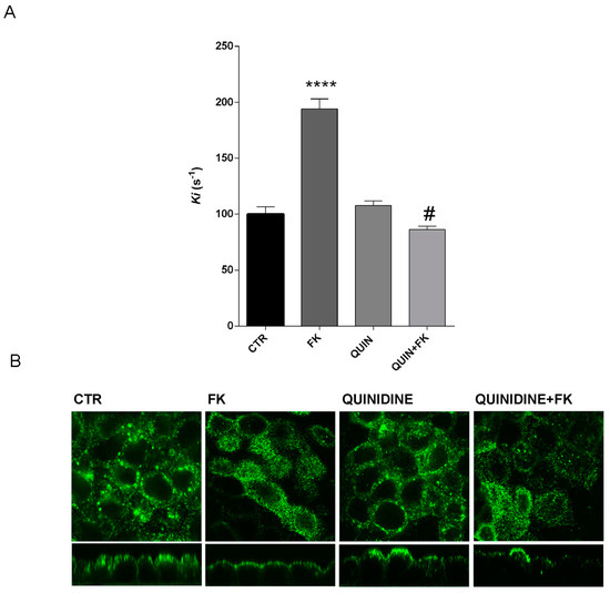 MCD4 cells were grown on polyester Transwell inserts and incubated in the absence or in the presence of PTX (2 µg/mL) for 3 h at 37 °C and either stimulated with 100 µM forskolin for 30 min or left under basal conditions and then fixed using 4% paraformaldehyde in phosphate-buffered saline (PBS). To test the effect of quinidine, in a set of experiments cells were preincubated with 10 µM quinidine for 45 min before stimulation with forskolin. Cells were permeabilized with 0.1% Triton X-100 in PBS for 5 min and nonspecific binding sites were blocked with 1% bovine serum albumin in PBS at room temperature for 1 h. Cells were then incubated with specific antibodies for 2 h at 37 °C. After washing in PBS, cells were incubated with the appropriate fluorescent secondary antibodies for 30 min at room temperature, washed in PBS and mounted on glass slides with Mowiol.