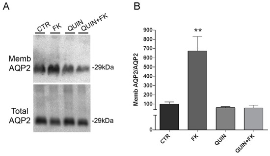 Cell surface biotinylation of AQP2 in MCD4 cells. (A) Immunoblotting analysis of total and apical AQP2 under different experimental conditions. Compared to untreated cells (CTR), FK significantly increased the abundance of AQP2 at the apical plasma membrane. Quinidine impaired FK-stimulated increase in cell surface expression of AQP2. Quinidine alone did not affect cell surface expression of AQP2. (B) Densitometric analysis of the 29 kDa biotinylated AQP2 band normalized to total AQP2 (values are reported as means S.E.Ms; ** p = 0.006 versus CTR).