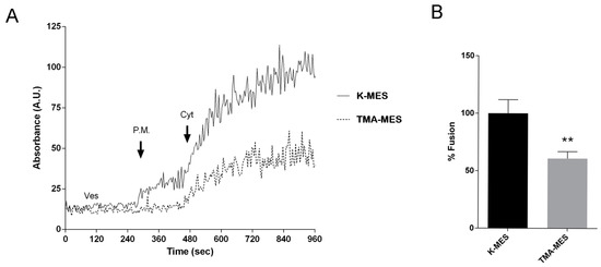 To evaluate the relevance of an inwardly chemical K+ gradient in the process of AQP2 vesicle fusion to the plasma membrane, we applied a fusion assay, as previously described [32]. This fluorescence technique allows real-time monitoring of fusion between membranes. AQP2 vesicles were isolated and labelled with R18, a fluorescent lipid probe, at self-quenching concentration. As a consequence of fusion with unlabelled plasma membrane, R18 dilution occurs, leading to an increase in the fluorescent emission signal. In the absence of cytosol, virtually no fusion occurs. The fusion occurred upon the addition of cytosol (arrow) indicating that it contains essential factors promoting the fusion (Figure 8A). Compared with control conditions (100 ± 11.54%), substitution of K+ in the medium with TMA, preserving the same osmolality, significantly impairs the fusion between vesicles and plasma membranes (39.22 ± 5.83%, n = 7, ** p = 0.007) supporting the concept that activation of K+ channels facilitate the fusion to the plasma membrane and this process requires a K+ inwardly chemical gradient.
