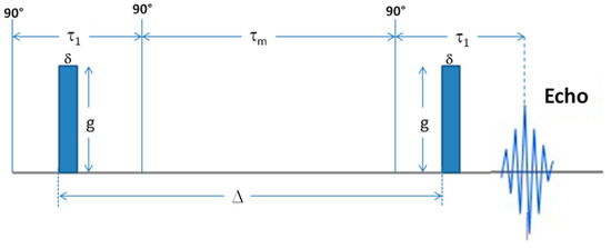 NMR measurements were performed on a Bruker AVANCE 300 Wide Bore spectrometer (Berlin, Germany) working at 300 MHz on 1H. The employed probe was a Diff30 Z-diffusion 30 G/cm/A multinuclear with substitutable RF inserts, suitable to measure the self-diffusion coefficients by the Pulsed Field Gradient (PFG) method. Specifically, the PFG-stimulated-echo (PFG-STE) sequence (see Scheme 1) [33], used in this work, consists of three 90° rf pulses (π/2-τ1-π/2-τm-π/2) and two gradient pulses (with magnitude g, duration δ and time delay Δ) that are applied after the first and the third rf pulses, respectively. The echo is found at time τ = 2τ1 + τm.