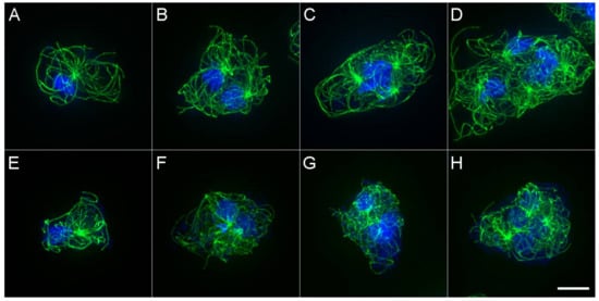 - Savoian, M.S.; Earnshaw, W.C.; Khodjakov, A.; Rieder, C.L. Cleavage furrows formed between centrosomes lacking an intervening spindle and chromosomes contain microtubule bundles, INCENP and CHO1 but not CENP-E. Mol. Biol. Cell 1999, 10, 297–311. [Google Scholar] [CrossRef] [PubMed]