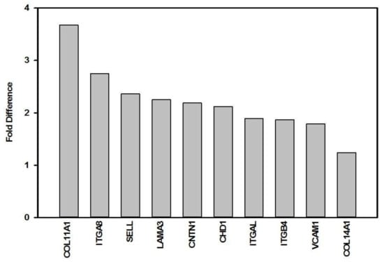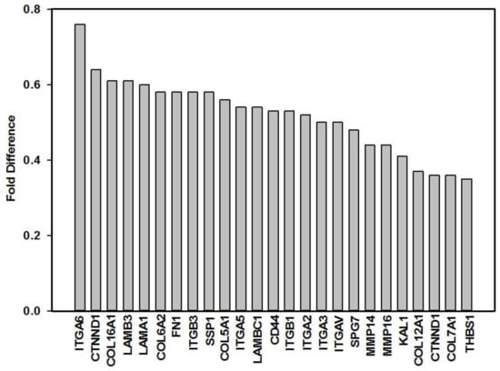 Forty-eight hours post-irradiation at a wavelength of 660 nm with 5 J/cm2, 64 genes related to CAMs was determined by real-time RT-qPCR in an in vitro diabetic wounded model (Table 3). Of the 64 genes, 25 were significantly down-regulated (Figure 1), while ten were significantly up-regulated (Figure 2). Eleven genes coding for transmembrane molecules were down-regulated (CD44, ITGA2, ITGA3, ITGA5, ITGA6, ITGAV, ITGB1, ITGB3, MMP14, MMP16, and SPG7), while five were up-regulated (CDH1, ITGA8, ITGAL, ITGB4, SELL, and VCAM1). Three genes coding for cell-cell adhesion molecules were down-regulated (CD44, COL6A2, and CTNND1), while five were up-regulated (CDH1, COL11A1, COL14A1, ITGA8 and VCAM1). Nine genes coding for cell-matrix molecules were down-regulated (CD44, ITGA2, ITGA3, ITGA5, ITGA6, ITGAV, ITGB1, ITGB3, and SSP1), and three were up-regulated (ITGA8, ITGAL, and ITGB4). Genes related to other CAMs were also regulated by PBM, and 11 genes were down-regulated (COL5A1, COL6A1, COL7A1, COL12A1, COL16A1, FN1, KAL1, LAMA1, LAMB3, LAMC1 and THBS1) and two were up-regulated (CNTN1 and LAMA3).