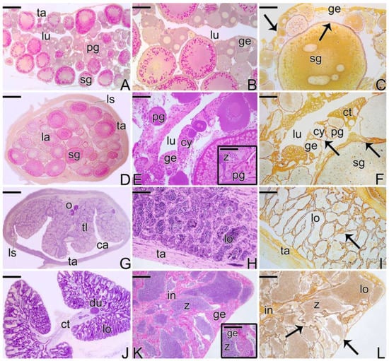 Four types of gonadal structures present in S. marmoratus: (A–C) Longitudinal section of ovary of a female. (D–F) Cross section of early transitional gonad, during the beginning of the sex reversal. (G–I) Cross section of testis of a secondary male. (J–L) Cross section of testis of a primary male. Note that the secondary male develops a single testis, whereas the primary male has a pair of testes. Note that the basement membrane, which supports the germinal epithelium, evidenced by the Reticulin Method, is present in all types of gonadal tissue organization (C,F,I,L). Tunica albuginea (ta), ovarian lumen (lu), primary growth oocyte (pg), secondary growth oocyte (sg), germinal epithelium (ge), lateral support (ls), ovigerous lamellae (la), germline cysts (cy), spermatozoa (z), connective tissue (ct), oocyte (o) testicular lamellae (tl), coelomic cavity (ca), testicular lobule (lo), testicular duct (du), interstitium (in), basement membrane (arrow). Staining: MY (A,B,D,G), HE (E,H,J,K), Reticulin Method (C,F,I,L). Bar: 300 µm (A,D,G,J), 50 µm (B,C,E,E-inset, F,H,I,K,L), 30 µm (K-inset).