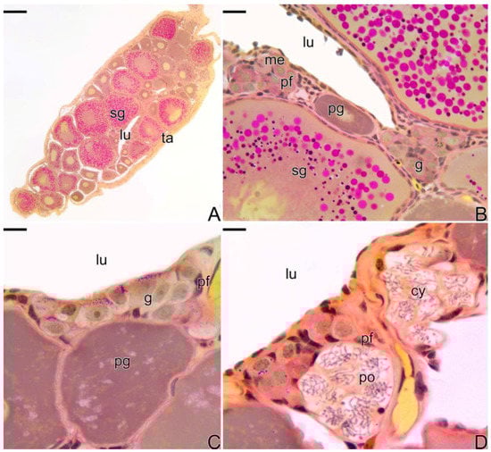 Histological section of ovary of S. marmoratus. (A) Cross section of ovary. (B–D) Details of A, showing the germinal epithelium, with germline cysts. Secondary growth oocyte (sg), ovarian lumen (lu), tunica albuginea (ta), metaphase (me), primary growth oocyte (pg), oogonia (g), pre-follicle cell (pf), pachytene oocyte (po), germline cyst (cy). Staining: MY. Bar: 200 µm (A), 20 µm (B), 10 µm (C,D).
