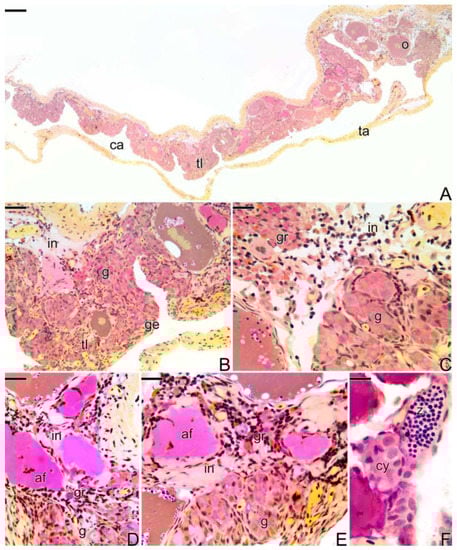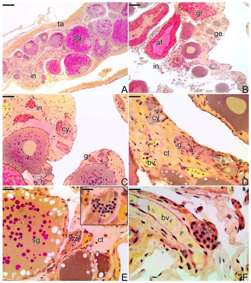 Histological section of final transitional gonad—the intersex of S. marmoratus. (A) General view of the gonad. (B–F) Details of A. Note the organization of the gonad in testicular lamellae (B) and the large amount of granulocytes that invade the interstitial tissue (C–E) close to atretic follicles (D,E). (F) Presence of the first spermatozoa. Coelomic cavity (ca), testicular lamellae (tl), tunica albuginea (ta), oocyte (o), interstitium (in), germinal epithelium (ge), gonia (g), granulocytes (gr), atretic follicle (af), spermatozoa (z). Staining: MY. Bar: 100 µm (A), 50 µm (B), 20 µm (C–E), 10 µm (F).