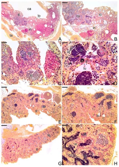 Histological sections of testes of secondary males of S. marmoratus. Note the progression of spermatogenesis, throughout the process of testicular development. Coelomic cavity (ca), interstitium (in), tunica albuginea (ta), testicular lamellae (tl), testicular lobules (lo), gemline cysts (cy), spermatocytes (c), spermatogonia (g), spermatids (st), basophilic filaments (fi), testicular lumen (lu). Staining: MY. Bar: 200 µm (A,E,G), 100 µm (B), 20 µm (C), 15 µm (D), 30 µm (F).