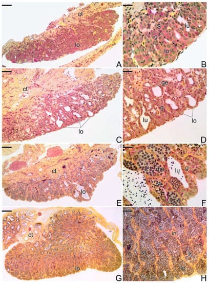Animals were anesthetized and immediately following, were sacrificed by decapitation and the gonads were quickly removed. Samples were then fixed in glutaraldehyde 2% and paraformaldehyde 4% solution in Sorensen buffer (0.1 M at 7.2 pH) for at least 24 h at room temperature. After fixation, the samples were dehydrated in a crescent ethanol series and embedded in Historesin (Leica HistoResin®, Buffalo Grove, IL, USA). Cross sections (3 µm) were stained with Ferric Hematoxylin/Eosin (HE); Toluidine Blue (TB); Schiff Periodic Acid + Ferric Hematoxylin + Metanil Yellow (MY) [37]; and with the Reticulin Method that enhances basement membranes. The Reticulin stain [38] uses an oxidizing agent, potassium permanganate, to oxidize aldehyde groups. Subsequently, the oxidized aldehyde groups are detected by the deposition of positive silver ions followed by their reduction using formalin. The result is a black hue of the reticulin fibers. As reticulin fibers are part of basement membranes, the method clearly detects basement membranes.