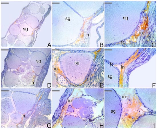 Immunohistochemistry for detection of MMP-14 (A–C), MMP-2 (D–F), and MMP-9 (G–I) metalloproteinases in an early transitional ovary of S. marmoratus. Secondary growth oocyte (sg), interstitium (in), follicle complex of the oocyte (fc). Counterstaining: Harrys Hematoxylin. Bar: 50 µm (A), 30 µm (B,H), 15 µm (C,E,F,I), 40 µm (D,G).