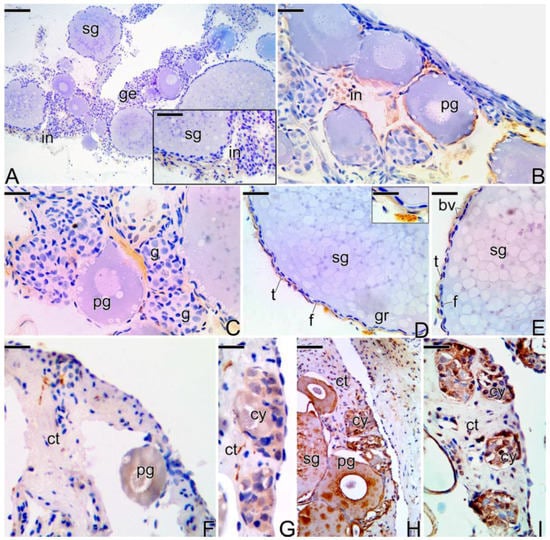 During the intermediate transitional stage (Figure 10A–E), the gonad shows interstitial cells marked positively at the detection of MMP-2, but at a lower intensity compared to the previous stage (Figure 10A). Some gonia, theca cells, ovarian stromal cells, and granulocytes also showed a positive response to MMP-9 (Figure 10B–D). Also at this stage, the MMP-14 enzyme was detected only in theca cells (Figure 10E).