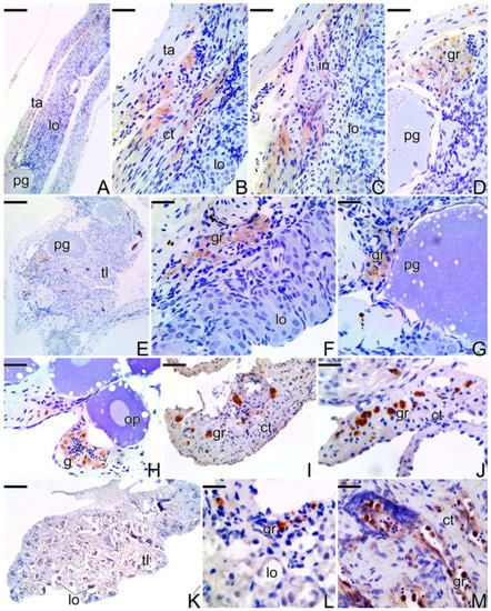 Immunohistochemistry for detection of MMP-9 (A–D,J), MMP-2 (E,F,I,K–M), and MMP-14 (G) metalloproteinases in testis of secondary males of S. marmoratus. Note the decline in the expression of the MMPs according to the end of the sex reversal process. Tunica albuginea (ta), testicular lobules (lo), connective tissue (ct), interstitium (in), primary growth oocyte (pg), granulocytes (gr), spermatogonia (g), testicular lamellae (tl), spermatozoa (z). Counterstaining: Harrys Hematoxylin. Bar: 80 µm (A,E), 40 µm (B,C,I), 30 µm (D,F,G), 20 µm (H,J,L,M).