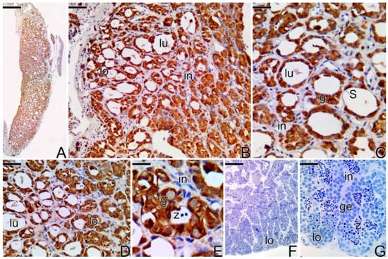 In testes of the primary males, MMP-2 and MMP-9 (Figure 12C) were detected in the spermatogonia that constitute the germinal epithelium of the testicular lobules. The same positive result was observed for MMP-14 (Figure 12D,E). After the beginning of the spermatogenesis, none of the enzymes was detected, not even in granulocytes or in melanomacrophage centers (Figure 12F,G).