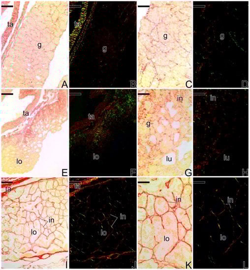 During the development of of primary male testes (Figure 14), the collagen fibers of the tunica albuginea show greenish tones (less mature collagen) and later, reddish tones (more mature collagen). At the interstitium, the fibers become more birefringent as testicular development occurs, showing younger collagen fibers (in green) (Figure 14A–H) which become older in later stages of development (in red) (Figure 14I–L).