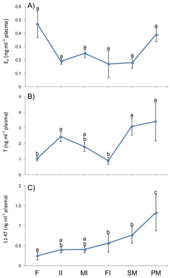 The variations in the plasma levels observed in the females in an early transitional gonad, with the increase of 17β-estradiol (E2) and decrease of testosterone (T) levels, can be associated with the aromatization of T, which leads to the synthesis of E2 [15,61].