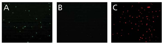Calcein staining permits selective detection of live, but not of dead target cells. Live calcein-stained K562 cells (green) are shown in (A). The image has been acquired by an ImmunoSpot® S6 FluoroCore Reader with the cells present in 100 µL culture medium in a 96 well flat bottom plate. (B) The same number of dead (ethanol-exposed) K562 cells has been plated with no calcein-stained cells detectable. (C) As in B, but PI was added to stain dead cells.
