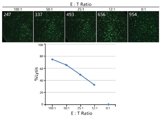 An example of the calcein-based TVA assay. A fixed number of calcein-labeled K562 target cells (5000/well) was incubated with effector cells (PBMC) at the specified effector: target (E:T) ratios in a round bottom 96 well plate for 4 hours. Subsequently, the cells were resuspended, and 3 × 50 µL from each assay well were transferred into triplicate wells of a flat bottom plate for imaging and counting in an ImmunoSpot® S6 FlouroCore Reader with the NK-TVA™ Software (by CTL). The numbers of live cells counted per well are superimposed on the images. Negative control wells that contain target cells but no effector cells establish the zero killing control value. The difference in viable cell counts is expressed and plotted as % lysis as the function of the E:T ratio.