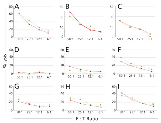 Comparing Calcein TVA with chromium release assay as the compendial method. The two assays were performed in parallel using the same PBMC, at the same effector to target (E:T) ratios and using the same numbers of K562 target cells. Each test condition was done in triplicate wells with the mean and standard deviation (SD) for these replicates shown. Red lines specify the results obtained with the chromium release assay, green lines those of the Calcein TVA assay. In Panels A–I, results are shown for individual donors, one in each panel.