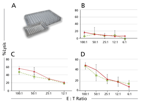 The Mini Calcein TVA assay compared with that performed in 96 well format. (A) shows a photograph of a Terasaki plate next to a regular 96 well plate. Calcein TVA Assays were done in parallel in both plate formats, using the same effector-target cell mixtures, of which 200 µL were plated into the 96 well U bottom plates (green lines), and 20 µL per well into the Terasaki plate (red lines). The results for three donors tested in parallel are shown in panels (B–D), respectively.