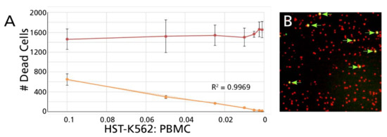 We used a freeze-thawed PBMC sample in which 88% of the cells were found to be viable and 12% dead after thawing. These cells were plated at a constant number of 12,500 PBMC per well, with a serial dilution of heat shock-treated (HST) K562 cells that had been CFSE-stained prior to the HST. (Due to the robustness of these tumor cells, HST killed only half of the K562 cells). PI was added to each well, followed by imaging and counting of stained cells. The number of double positive (CFSE/PI positive “killed target”) cells decreased with close to perfect linearity (R2 = 0.9969) while the number of single positive red (PI, dead PBMC) stayed constant while the expected and counted cell numbers in each condition closely matched up (Figure 6). Thus, even a single killed K562 target cell could be detected within the 12,500 PBMC, of which 1500 were dead PBMC.
