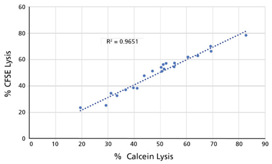 In Calcein TVA, the counting of live target cells can be done directly, as dead targets lose the dye. The counting of live target cells in the CFSE/PI assay, however, is dependent on the correct recognition of not only the single CFSE-positive (live target cells) but also of the CFSE/PI double positive (killed target) cell fractions. The live target cell number in the CFSE/PI assay, therefore, is calculated by the numbers of all CFSE-positive cells (all target cells, live or dead) minus the dead target cell numbers (the CFSE/PI double-positive number). Once the number of live targets has been established in this way, percentage killing is calculated in the same way as in the Calcein TVA assay [% killing = (live cells counted/live cells in negative control) × 100]. We performed Calcein TVAs and CFSE/PI TVAs in parallel, testing the same PBMC for NK activity towards K562 target cells (that were either labeled with calcein or with CFSE prior to testing). The resulting curves were superimposable—in Figure 7 results are shown for the 100:1 data point for 21 PBMC for which the comparison of the two assay formats was done. The correlation was close to perfect, with R2 = 0.9651.