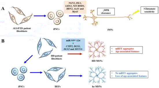 A schematic diagram illustrating the recent advances discussed. (A) Induced motor neurons (iMNs) generated from ALS/FTD patient iPSCs exhibiting increased sensitivity to glutamate and decreased clearance of dipeptide repeat (DPR) proteins. (B) Striatal medium spiny neurons directly induced from HD patient fibroblasts (HD-MSNs) exhibited clear HD neuronal phenotypes of mutant Huntingtin (mHTT) aggregates and age-associated features like DNA damage and oxidative stress, which is not seen in MSNs derived from human embryonic fibroblasts (HEFs) generated from patient-derived iPSCs (he-MSNs).