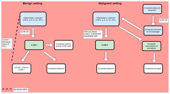 - Wu, M.-H.; Yang, B.-C.; Lee, Y.-C.; Wu, P.-L.; Hsu, C.-C. The Differential Expression of Intercellular Adhesion Molecule-1 ICAM-1and Regulation by Interferon-Gamma during the Pathogenesis of Endometriosis. Am. J. Reprod. Immunol. 2004, 51, 373–380. [Google Scholar] [CrossRef] [PubMed]
