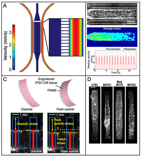 (A). Schematic of the device: the central cell loading channel is connected to the lateral C-shaped medium-delivering channels by a “ladder” of thin microchannels, purposely design to protect cells from shear and switch to a diffusive mass transport regime. The colors are representative of the linear velocities on a chosen plane, and show decreasing values from red to blue; (B). Characterization of the 3D cardiac tissue formed in the middle channel. Top: optical microscopy image showing tissue density and overall organization and alignment; middle: heat map of the average motion generated by the contractile activity and, bottom: corresponding average beating kinetics. Adapted with permission from Mathur et al. [127]; (C). Top: schematic representation of contracting constructs and approach to measurements; Bottom: iPSC-CMs seeded onto thin elastomers with patterned lines of fibronectin self-organized into microscaled myocardial tissues and exhibited contractile properties in response to electrical stimulation; (D). Representative images showing actinin staining of iPSC-CMs on micropatterned fibronectin rectangles. BTHS iPSC-CM micro-tissues show impaired sarcomere organization (BTHS1 and 2 in Galactose and Glucose medium, respectively), while cells transfected with TAZ modRNA (Mod BHTS) clearly demonstrate a rescued organization, comparable to that of the control cultures (CTRL). Adapted from Wang et al. [128].