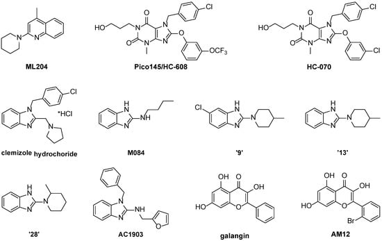 | HC-070 | TRPC1/4/5 (0.3–2 nM; La3+ or carbachol/muscarinic receptors) | Not known | Highly selective; suitable for in vivo use | [66,67] |