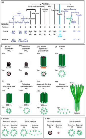 Spermatozoon typical and atypical centrioles have diverse structures in animals. (a) Phylogenetic tree with representative animal groups. Number of centrioles (first row), which centriole is typical and atypical (second and third rows, respectively), and type of centrioles as well as their modifications (in parenthesis) are indicated; RL, reduced diameter of the centriole lumen; Db, nine doublets of microtubules instead of triplets; PCL, proximal centriole-like structure as depicted in panel “b” or “d”; Pro-c, procentriole; CP, centriole with central pair. (b) Models of spermatid and spermatozoa proximal and distal centriole. The centrioles are depicted from side and top views and are to scale. (c,d) The structural differences between spermatid centrioles and spermatozoa centrioles in human (c) and fly (d).