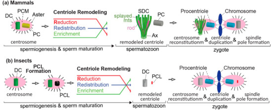 Altogether, animal early spermatids are initially similar to undifferentiated cells with a mother centriole (the distal centriole, or DC), a daughter centriole (the proximal centriole, or PC/PCL), and a cilium attached to the mother centriole. Both of these centrioles are later modified by centrosome reduction and the centriole remodeling process. However, two centrioles remain in the spermatozoon, and contribute to the zygote during fertilization (see below) (Figure 5).