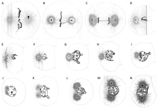 Boveri’s research on the first cleavage in the early embryo of Ascaris megalocephala to demonstrate the centrosome ’cycle’. Embryos were stained with iron haematoxylin. (A) Bipolar spindle with spherical centrosomes. Within the centrosomes, centrioles were drawn as small black dots (arrowhead). (B) Arrangement of chromosomes at the metaphase plate. (C) Separation of chromosomes and change in the shape of centrosomes from spherical to biconvex-discoidal. (D) Constriction between forming daughter cells, start of centrosome flattening. (E–H) Primary blastomeres. Centrosomes become spherical again (E), but smaller compared to the one-cell embryo. The nuclear vesicle is forming and the centrosome starts to divide again (F,G). (I) Separated centrosomes remain close to each other with the two asters clearly visible. (J,K) Daughter centrosomes move apart while growing in size. (L) The growing spherical centrosomes are completely separated. (M,N) Centrosomes move to opposite sides of the nucleus until they form a bipolar second spindle with full-sized centrosomes. The centrosomes show a ‘core’ and an outer layer. Reproduced from [2].