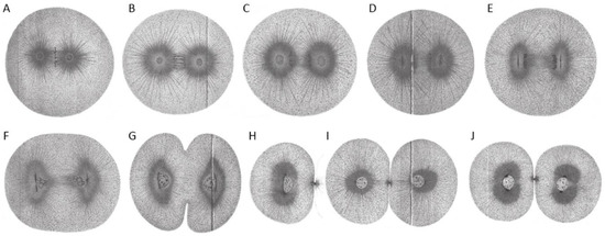 First cleavage in the early embryo of Echinus microtuberculatus. Sea urchin embryos were fixed in picric-acetic acid and stained with iron haematoxylin. (A) Chromosomes are arranged at the metaphase plate (equatorial plane). Centrosomes are spherical. (B) Centrosomes increase in size while homologs become separated. (C) Centrosomes start to flatten in the direction parallel to the division axis. (D) Flattened centrosomes change to discoidal form. (E) Centrosomes adopt a discoidal shape. (F) Spindle and egg elongate. Chromosomes are visible and centrosomes start to divide. (G) Cytokinesis of the embryo starts. (H,I) Embryonic daughter cells are formed (side-view (H) and cross-section/top-view (I) according to division axis). (J) Each daughter cell contains a nucleus and two centrosomes. Reproduced from [2].