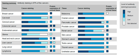 - Uhlén, M.; Björling, E.; Agaton, C.; Szigyarto, C.A.; Amini, B.; Andersen, E.; Andersson, A.C.; Angelidou, P.; Asplund, A.; Asplund, C.; et al. A human protein atlas for normal and cancer tissues based on antibody proteomics. Mol. Cell. Proteomics 2005, 4, 1920–1932. [Google Scholar] [CrossRef] [PubMed]