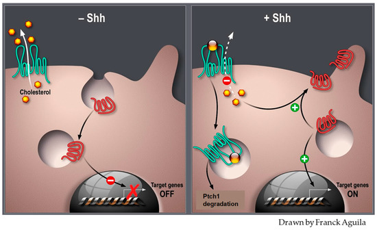 The regulation of Smo activation by Ptch1 is altered in many cancers. The mechanism by which Ptch1 represses Smo has been the subject of numerous studies. For example, Taipale and co-workers [49] showed in 2002 that Ptch1 inhibits Smo sub-stoichiometrically, suggesting that there is no direct interaction between Ptch1 and Smo. Several small molecules modulate Hh signaling through direct binding to Smo, and some Smo antagonists are in clinical trials for treating tumors [21,50]. Moreover, several studies have reported that Smo can be repressed by molecules such as vitamin D3 [51], and activated by oxysterols [52,53,54] and phosphatidylinositol 4-phosphate [55]. On the basis of these observations and the sequence homology of Ptch1 with bacterial transporters, Ptch1 has been proposed to function as a transporter that could change the concentration of small molecules involved in Smo activation or inhibition [49,56].