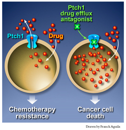 It has long been postulated that the multidrug efflux transporter P-glycoprotein (P-gp/ABCB1/MDR1) mediates the main mechanism of resistance of cancer cells to chemotherapeutic agents; however, recent studies have shown that the Hh receptor Ptch1, which is over-expressed in many recurrent and metastatic cancers, pumps chemotherapeutic agents such as doxorubicin out of cancer cells, and thereby also contributes to chemotherapy resistance. Therefore, the use of an inhibitor of Ptch1 drug efflux activity in combination with classical or targeted chemotherapy could be a promising therapeutic option for Ptch1-expressing cancers.