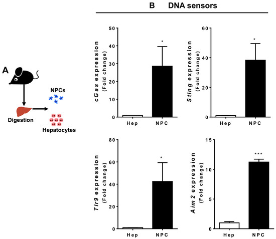 DNA sensor expression in different liver cell populations. (A) Scheme showing two groups of isolated hepatic cells—parenchymal (hepatocytes) and non-parenchymal (NPCs) cells—from healthy mice. (B) Gene expression comparison of different DNA and cytokine sensors between these two populations. The graphs represent the mean expression of selected genes relative to hepatocytes (ΔΔCT). (Mean ± SEM; n = 4); * p ≤ 0.05 and *** p ≤ 0.001 compared to hepatocytes.